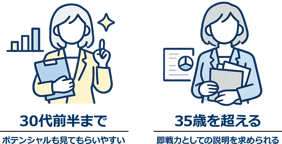 未経験への挑戦が全くできなくなるわけではありません。けれど、30代前半まではポテンシャルも見てもらいやすく、35歳を超えると即戦力としての説明を求められやすくなります。実績がある人とない人の差が目立つ時期です。